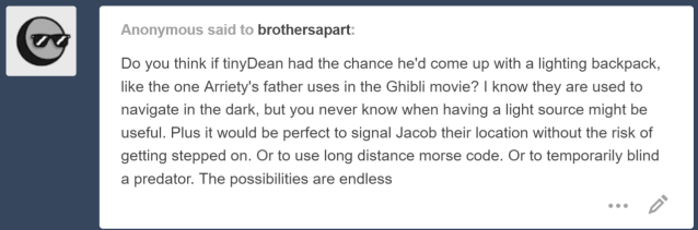 It’s certainly the type of thing that’s right up Dean’s alley! He is the craftier of the brothers, and will put his mind to work on various problems that he runs across during his tiny tenure in Brothers Lost. In fact, long distance Morse Code is used in one of the various stories, but tiny Dean is not the one to do it!