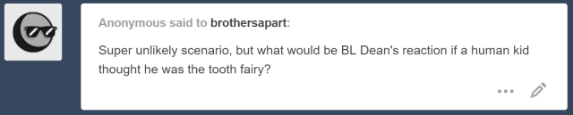 From my end, writing these stories with smol Dean has been a blast. Jacob may be super fun to write as the small one, but at the end of the day he was written to be a gentle giant. I think smol Dean (with the smol Sam that he will protect to the end) is a great counter to Jacob’s character.
