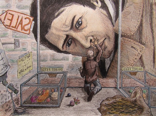Sam’s eyes widened as the strange human shoved his way into the room. Those dark eyes held only malice and contempt as they fell on him first, then expanding their view to all the small people on the table with him.