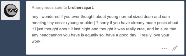 Hopefully they’d discover that a quicker way to his heart is to give him food and to be hands-off at least at first. Oscar’s only ever heard about how bad humans are, after all! He is very little and they are very big, and the Winchesters are extra big. Just gotta give him time (and maybe pizza).
