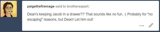 And therein lies one of the big differences between Sam and Jacob. While they might both seem like shy little mini-Sasquatches, Sam is far more likely than Jacob to tell someone off. Jacob doesn’t like confrontation and he will avoid it even if it means silently dealing with Dean’s well-intentioned but stifling protectiveness.