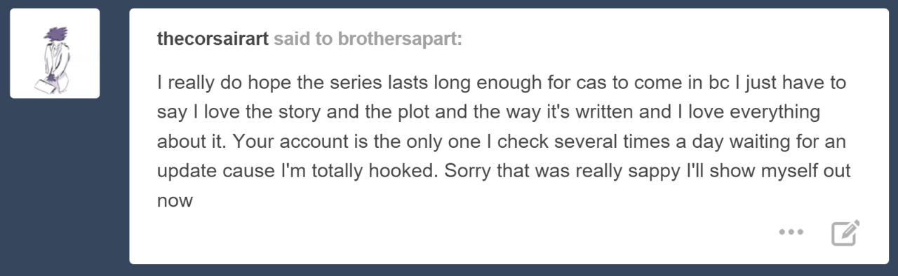 ((Hello all! For those that know me and those that don’t, this is @nightmares06 with my entry for the contest going on at @asksamstuff! If you don’t know the blog, I highly recommend checking out! There is wonderful content over there, all quality-done supernatural comics that are so inspirational to check out! So inspirational that I’ve written this contest entry based on one of them! Posted to the BA blog since the majority of my readers are found here.))