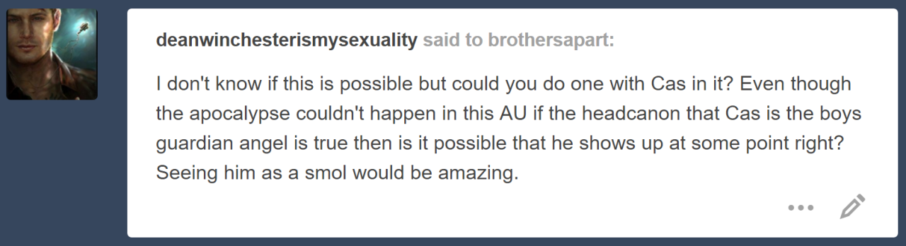 Squatting down on the ground, Sam lowers himself to the kid’s level, unable to leave him staring up at him with his neck tilted so far back. “You’re… Dean, aren’t you?” Sam asks in awe, understanding now why Castiel wasn’t around.