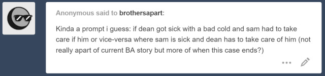 This won’t be a prompt I’m doing at the time, but @chewbaccaaah actually did a cute short story of exactly this for the contest! Check it out for some sick!Dean and caring Sammy: