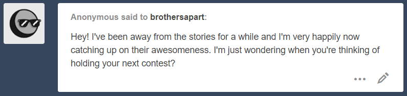 The winner of the contest for the prize of the comic prompt is @withthedemonblood! Please e-mail me and we can get your unique Sam-centric comic started for you, your eyes only! Unless you wanna post it when you get it. Y’know. Whatevs.