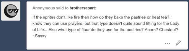 This is a good question, and it’s one that I had to answer early on when developing the sprites if I wanted to get anywhere, since they can live in wintry climates just as often as warmer ones. The sprites do use a Prayer to get warmth, though it has some caveats to it. They have to be Praying over a living tree, and preferably one that has already been influenced by the Prayers to shape it into a home. It can heat up the wood and, depending on the shape they are using, provide the heat they need for boiling water for tea or baking pastries (usually acorn flour pastries, but this depends on what’s available to the sprites; some can get actual wheat).