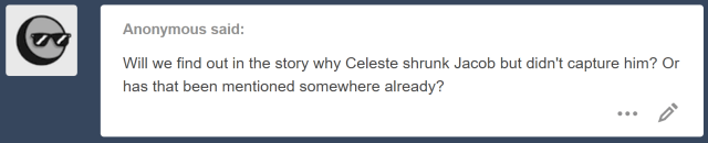 Meanwhile, Jacob’s size change was due to chaos spellwork when he was a giant, and the person that is responsible for his current ‘little’ issue the story ended on has yet to be revealed, and will be a big part of the sequel (which we currently only have the description written down for).