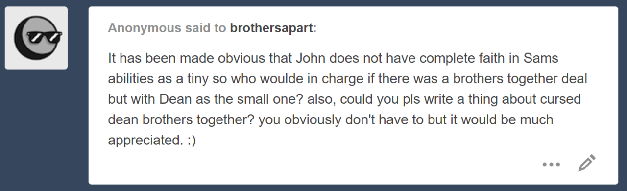 Sam gave Dean a half-hearted grin, knowing how independent his borrower-sized brother could be. “I guess I’ll let you get to work,” he said dryly, lifting his hand so Dean had room.
