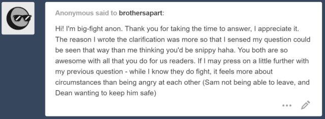 Jacob sent Sam an encouraging smile. He nodded and shifted his hand slightly to make it easier to sit down. He didn’t want to interrupt Dean any more than Sam, however, so he didn’t say anything either.