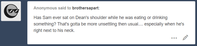 Sam’s learned to ignore it as best he can. He doesn’t want to go making Dean self-conscious with something they can’t help, and if Dean’s driving while he eats a quick bite, Sam wouldn’t want to be down on the seat of the car. Too unsafe for a guy too small for a guy who can’t wear a seatbelt.