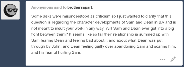 Over time, Sam’s getting better at both realizing he’s fine no matter how pissed off Dean gets and hiding it if he does get intimidated. There will always be arguments between these two, because what two brothers don’t fight? However, the dynamic of the fights will continually change as well depending on how their relationship is doing at the time.