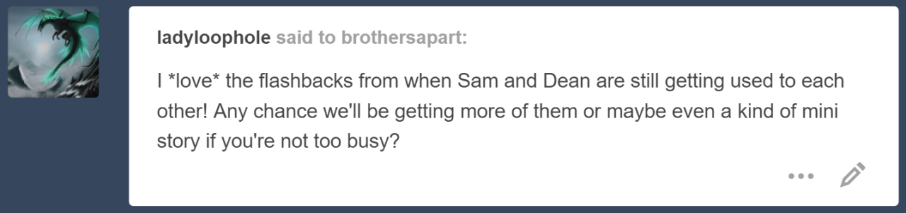 Sometimes Sam wonders what would have happened to them if Dean had been struck by the curse as well. Or if the witch had chosen to strike at the older Winchester in the moment before their dad busted down the door.