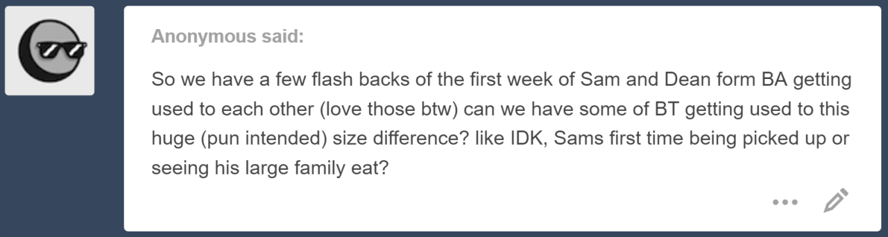 Dean’s lips thin to a line, and Sam feels tension start to wind up his back. The sight of a giant with an intense glare like that on his face is not easy to take in at four inches in height. Dean doesn’t mean it, but his size gets in the way of an innocent look.