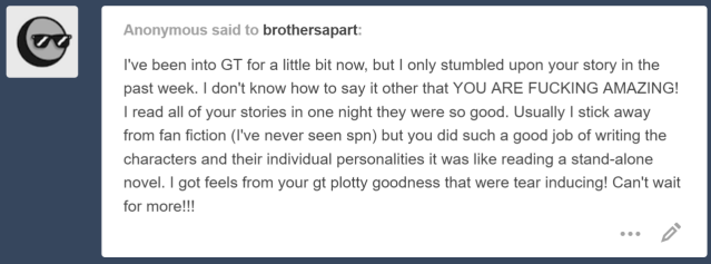 The next thing he could remember was waking up, his entire world changed. It was dark. Closed off. Two people were in the room watching over them. A woman, her blonde hair and blue eyes gentle as she helped Dean off of the stacked up fabric. She was tiny, even next to himself as a kid. In fact, Sam wasn’t far off of her height back then. He’d outgrown her in only a few years.