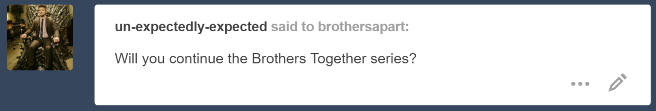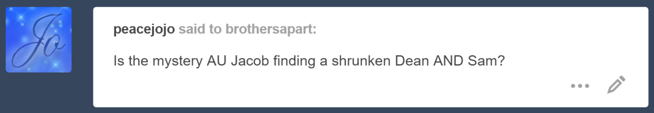 So would meeting little Oscar turn out fairly similar in the Brothers Saved AU as it did in Brothers Together? It would be interesting to see the dynamic when Oscar and Dean are the “same size” (we all know Oscar would still be smaller, poor guy!), but would their relationship change too much based on their sizes? Frankly, Oscar could be put in every AU and I would be happy. 👍🏼