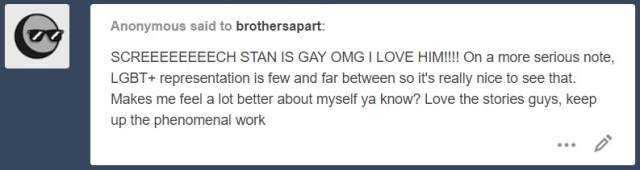 I don’t think it’s rude at all! Headcanons are headcanons for a reason. @nightmares06 writes Dean as straight and Stan is in a relationship by the time they meet in Brothers Consulted, so they won’t end up a couple at all in our stories, but it’s perfectly fine to think up your own versions of the story as long as you don’t demand we make it canon.