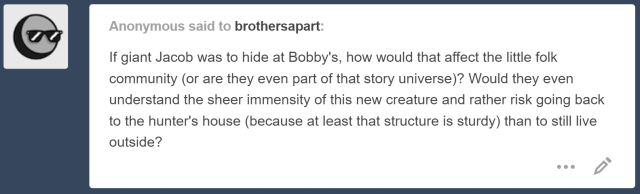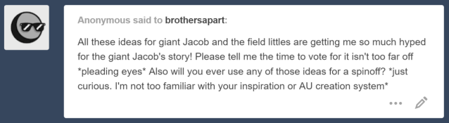 We do have other ideas that include giants, but none that include the burrow currently. We’re working on some of the other ideas for our other storylines we came up with while we were writing giant Jacob, and have a bit of a backlog for the other AUs that we put off to write it. What happens, happens! There will be plenty for everyone to love :3