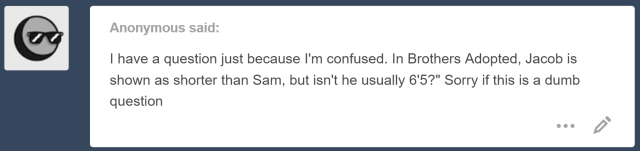 At the sight of Jacob’s exasperated struggles, Dean let out a small sigh and took slight pity on him. “Okay, how about this. I don’t even have to tell you how tall you are.”