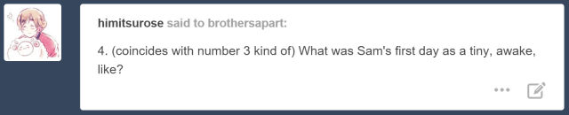 This story will take place a little over a month after Sam is initially cursed, and two weeks after Sam first hitches himself a ride in Dean’s pocket to school. So, they are starting to get used to him being tiny, but there’s a lot he’s not prepared for. He’ll need a teacher.