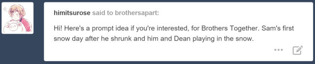 “You’ll have to get something to cover up your hands, and maybe some extra shirts,” Sam prattled happily on, “I even have the extra dollhouse shirts that Dean got me on so I keep warm. And nice and warm feet, can’t let them get cold or we’ll have to come in early. I mean, how many times do we get a snow day this early on in the year?!” His eyes shone with his excitement.