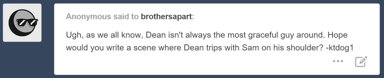 Not gonna lie, I’m the person that reads about the one time Sam got shoved into Dean’s pant pocket and my first thought is “I wish I could see that scene” 😂 All I can picture is Dean being flustered and Sam being grouchy…