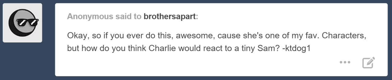Oh, I’d love to do Charlie, but I don’t know if the fic would make it all the way to season seven and eight. She’s such a bright ball of sunshine. Sam would probably get a kick out of all the action figures she has. At least if Sam breaks into her home like the Winchesters did that first time he wouldn’t so much scare the crap out of her. She’ll think she found a borrower living in her house!