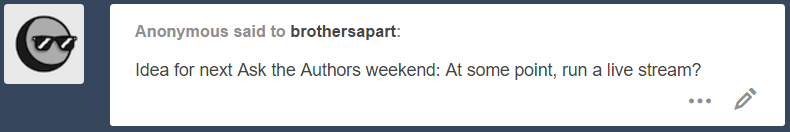I’ve watched streams, but I don’t think I could actually run one myself. I have a pretty bad anxiety about talking online or using webcams (my new computer doesn’t even have one), but I think we can manage something similar.