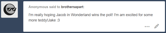The poll has ended and a winner decided! With a commanding lead against everything else ever, Jacob in Wonderland, aka the ‘horror story’ has won!