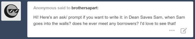 In line with there being a full-fledged story in development for the Dean Rescues Sam AU, I’m also renaming it Brothers Together after a friend suggested it. If you have any asks/prompts for the AU, feel free to submit them. They may possibly be incorporated into the story in development. Standard prompt rules apply.
