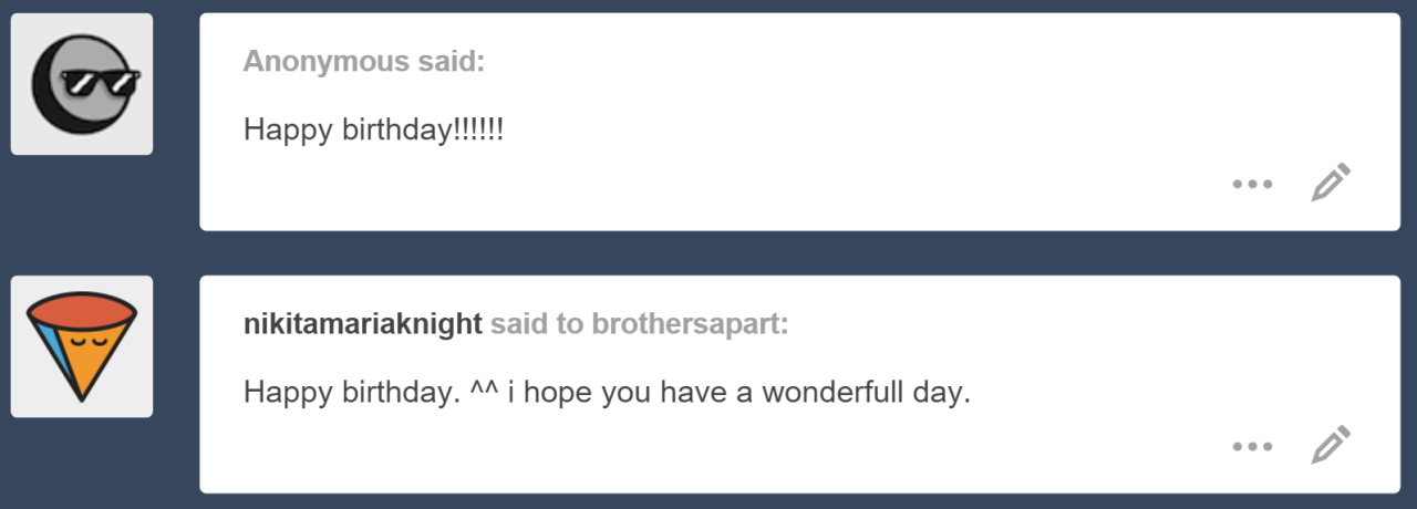 It’s so good to hear from you! Good luck going through our tumblr– it’s gotten a bit messy, but there’s a looooooot of stuff here for future stories/snippets/sneak peeks, along with tons of musing and prompts/asks. And all the wonderful arts :3 Not to mention the asks we get in, which are tons of fun answering.