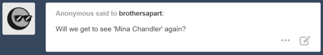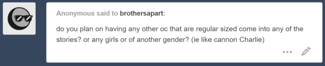 Hmm, this is a tricky question. I do have female OCs, but it’s not likely they’ll play a large part in this story at any time. Beth and Isabelle aren’t likely to be seen again in the story, and Evelina wouldn’t fit. Unless the story goes for a few more (Supernatural) years, we won’t be seeing Charlie much either. Of course, Mina and Celeste can appear back in the story at any time, so there’s a possibility for you!