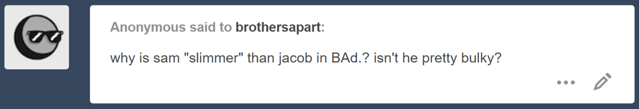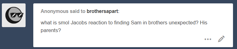 If Sam could inch away from the two giants the pocket concealed him from, he would. The stern tone of voice Jacob’s mom had taken on was very familiar, and Sam couldn’t stifle an involuntary yelp of surprise. He heard it from his dad almost constantly. Dean was the patient teacher, John was the stern drill sergeant.