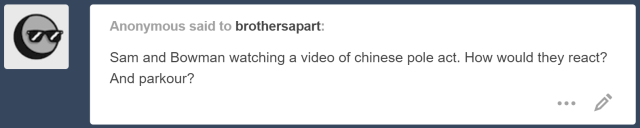 “Hang on,” Sherlock warned Dean, giving him a second to brace himself before jumping up to catch the lowest rung of the escape stairs and drag them down to ground level.