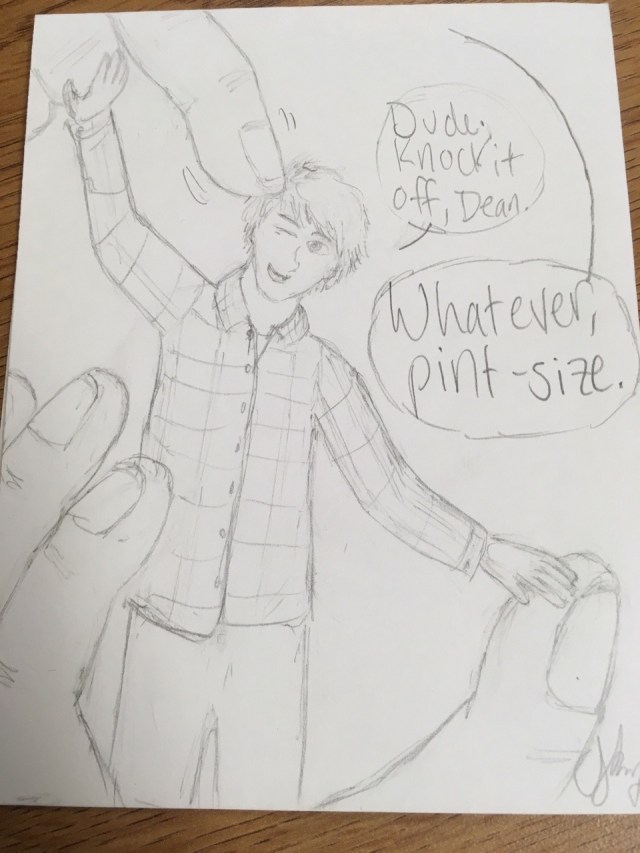 Nodding, Dean stood and went over to the shelf, knocking idly at Sam’s wall. “C’mon, pint-size, get your act together!” he called through the holes sculpted into the walls. Both giving Sam a way to communicate, a way to get air, and some extra light on the interior. “The night’ll be half done by the time you’re ready!”
