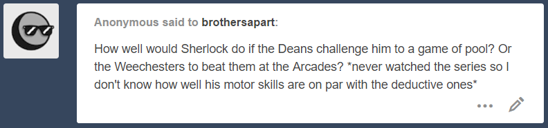 One of Dean’s advantages will be the fact that there’s like five more of him cheering him on and sassing Sherlock all together (aside from Sherlock’s Dean, who’s going to be so offended that most of the Deans are full sized).