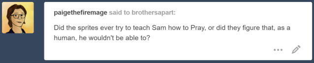 This is a good question, and it’s one that I had to answer early on when developing the sprites if I wanted to get anywhere, since they can live in wintry climates just as often as warmer ones. The sprites do use a Prayer to get warmth, though it has some caveats to it. They have to be Praying over a living tree, and preferably one that has already been influenced by the Prayers to shape it into a home. It can heat up the wood and, depending on the shape they are using, provide the heat they need for boiling water for tea or baking pastries (usually acorn flour pastries, but this depends on what’s available to the sprites; some can get actual wheat).
