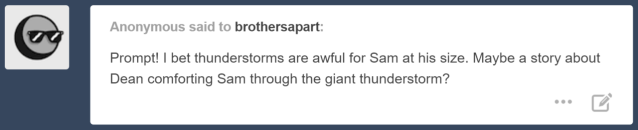 “Just watch where you toss your dirty socks,” Sam snarks up at his brother, feeling the last of the tension sloughing off at the return of their normal banter. Moments like this were when he barely even felt the size difference, and it was good. “I don’t need the nightstand smelling like dirty feet all night.” He wrinkles his nose and is rewarded with a chuckle from Dean.