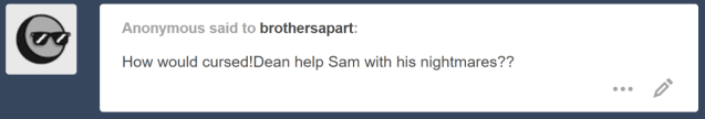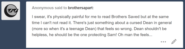 Sometimes Sam wonders what would have happened to them if Dean had been struck by the curse as well. Or if the witch had chosen to strike at the older Winchester in the moment before their dad busted down the door.
