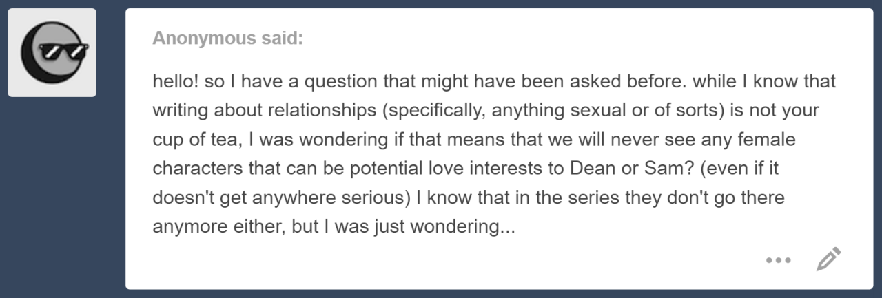 As for same-size relationships, Dean’s had a fling in Brothers Lost with a borrower he encountered on a hunt, and in the last season of Brothers Apart, Sam will also be finding himself some love!