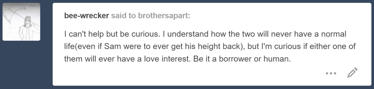 hi I’ve been a big fan of yours ever since I read your stories while you were still in the midst of posting Taken though it’s been more on the stories side and it’s only recently I’ve started reading through everything here so I don’t know if you’ve answered this before, but would you ever write a story where a borrower and a human are in a relationship? could be platonic romance or whatever you feel like but I’m just wondering