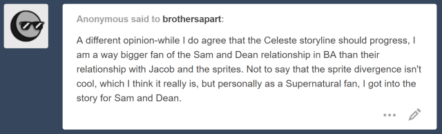 ( I’m glad you added in the part that you enjoyed the stories with the other characters because otherwise, I am salt on this entire topic after the times it’s been asked )
