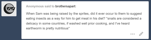 And lets remember that Sam isn’t a big meat-eater like his brother is! It would be easier for him to adapt to a steady diet of roots, vegetables, mushrooms and fruits, along with Sam and Bowman’s favorite honeycomb!