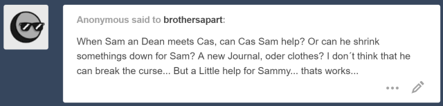 Dean’s lips thin to a line, and Sam feels tension start to wind up his back. The sight of a giant with an intense glare like that on his face is not easy to take in at four inches in height. Dean doesn’t mean it, but his size gets in the way of an innocent look.