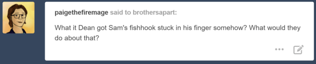 The group was silent as they climbed down from the nightstand one after the other. Sam’s hook was the one that was lodged into the top, the sturdiest hook in the motel. Dean had once suggested replacing it now that Sam had access to more supplies than he could ever dream of back when he’d lived at Trails West, but nothing they found could equal the three prongs. It was sturdy, it was versatile, and it was lightweight enough for Sam to haul it around day in and day out, dangling from his satchel. If he was to come up against an enemy one-on-one with nothing more than his hook on hand, he would be a force to be reckoned with. That hook was nasty.