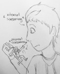 I didn’t want to spend the inevitable eons coloring this, since this is all about getting practice actually drawing the dang stuff, but it looked weird as just line art so have some grayscale. (Also I realize Sawyer does not look super stuck but believe me he is, the doorway is v smol. Plus all my lines are shaky but hey, I guess that’s why I’m practicing.)