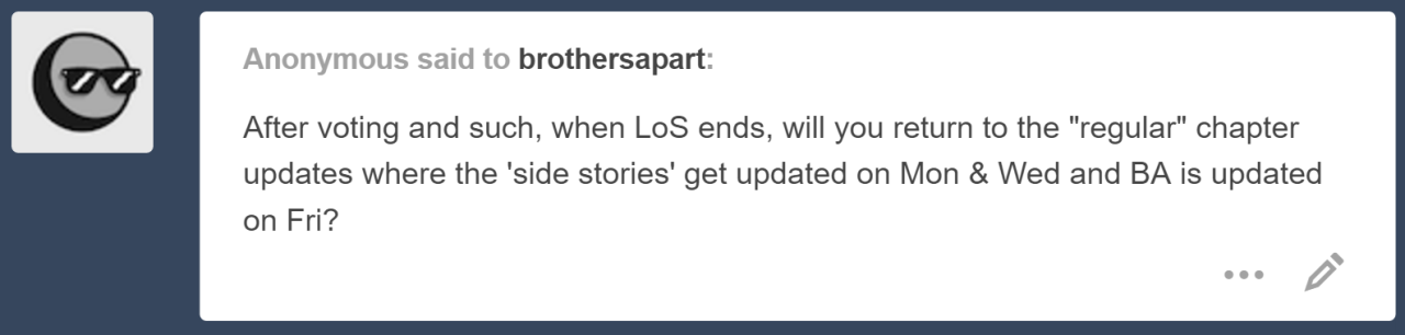 Also, I work a high-stress, full time job. Having more than one story posting at a time was a drain for me. Which is why after LoS is complete, we will not be switching back. The entire point of me switching to one story at a time was to reduce the amount of stress I have at home while I’m doing what I love. Don’t expect this to change.