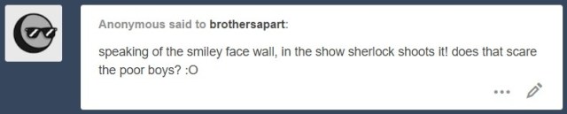 Since then they decided to remain in the flat and now make use of the smiley face as a lookout point to check on the humans, or as we’ve seen, a convenient perch to bait Sherlock from.