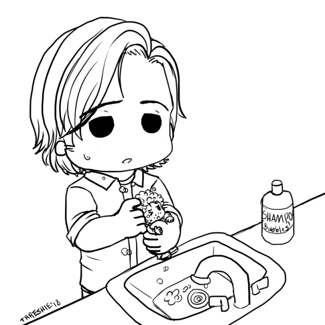 Looks like he’s in a bit of hot water when his hook and line slip and fall down off of the porcelain sink!