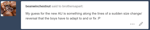 This is a cute idea, but it’s more likely to appear as a story within one of the AUs, it won’t be an AU on its own. Can you just see how offended Sam will be if he wakes up in a room full of normal-sized furniture? He’d be yelling at Dean for pranking him in a dollhouse!