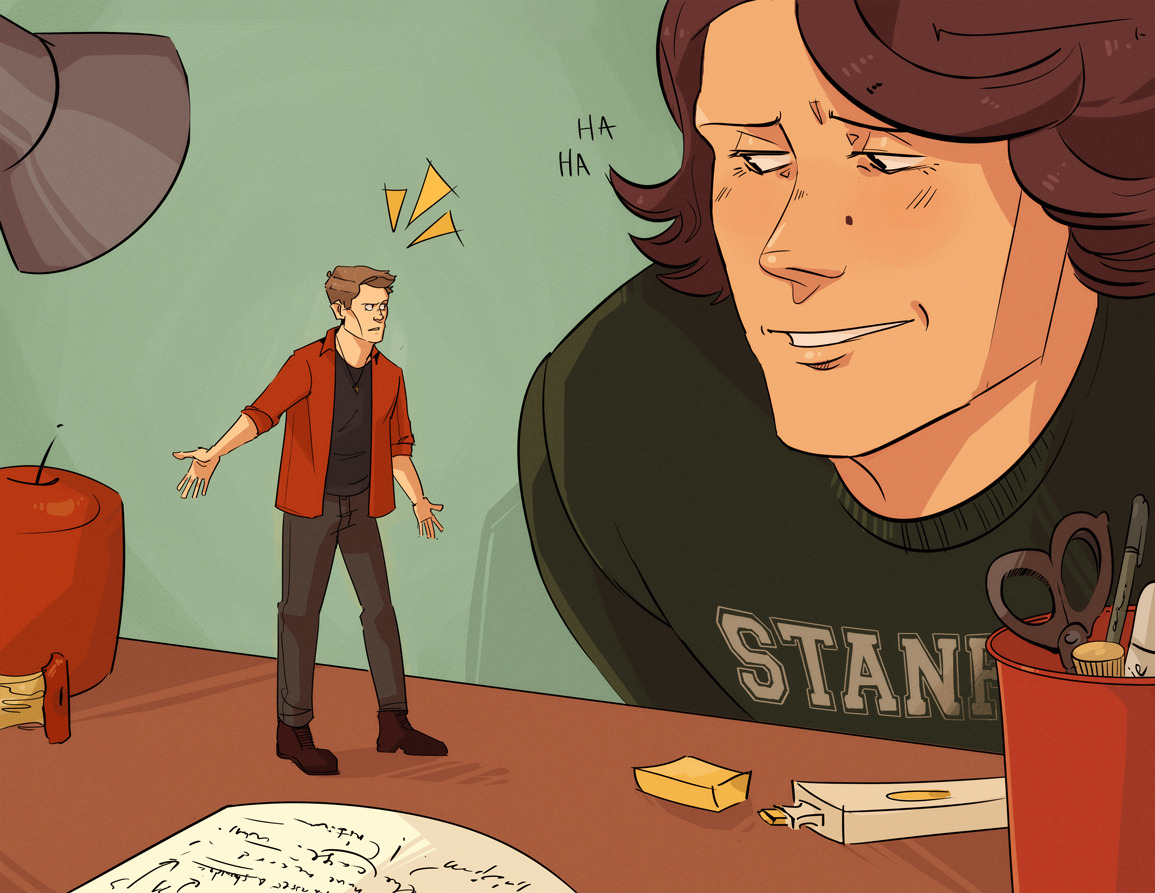 Sam gave Dean a half-hearted grin, knowing how independent his borrower-sized brother could be. “I guess I’ll let you get to work,” he said dryly, lifting his hand so Dean had room.